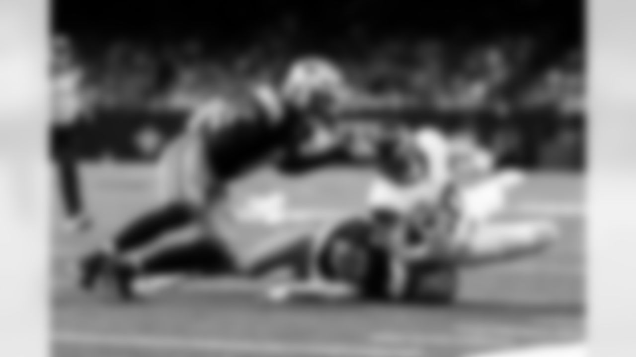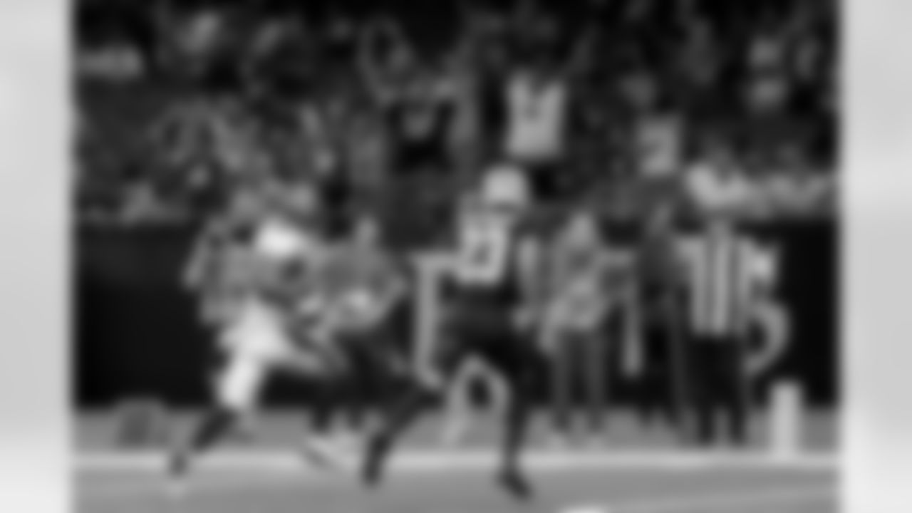 Tampa Bay Buccaneers running back Sean Tucker (44) scores on a 5-yard run in the fourth quarter as New Orleans Saints cornerback Marshon Lattimore (23) gives chase during the NFL game on Sunday, Oct. 13, 2024 in New Orleans. (Michael DeMocker/ NFL LCC)