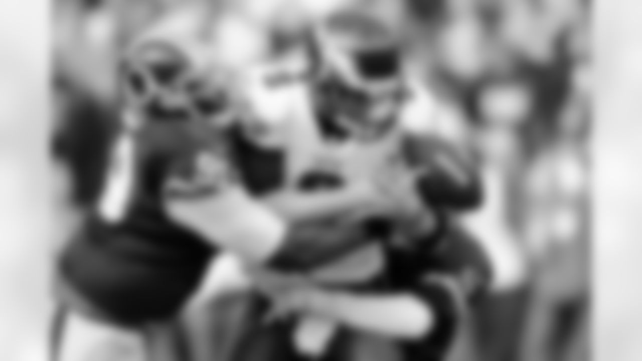 Redskins defenders pressure and force a fumble from Eagles QB Nick Foles.