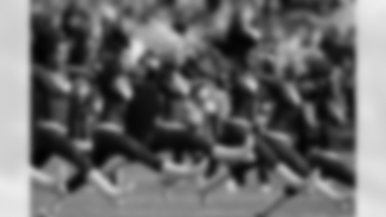 Cheerleaders and members of the armed forces line up to welcome the players to the field.